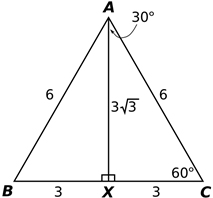 10. D. Since the triangle is an equilateral triangle, its angles are 60°. In addition, the vertical line AX bisects the angle BAC, so it splits it into two congruent angles of 30° each. Therefore, the two smaller triangles are 30-60-90 triangles. Thus, the ratio of the lengths of the sides is 1: